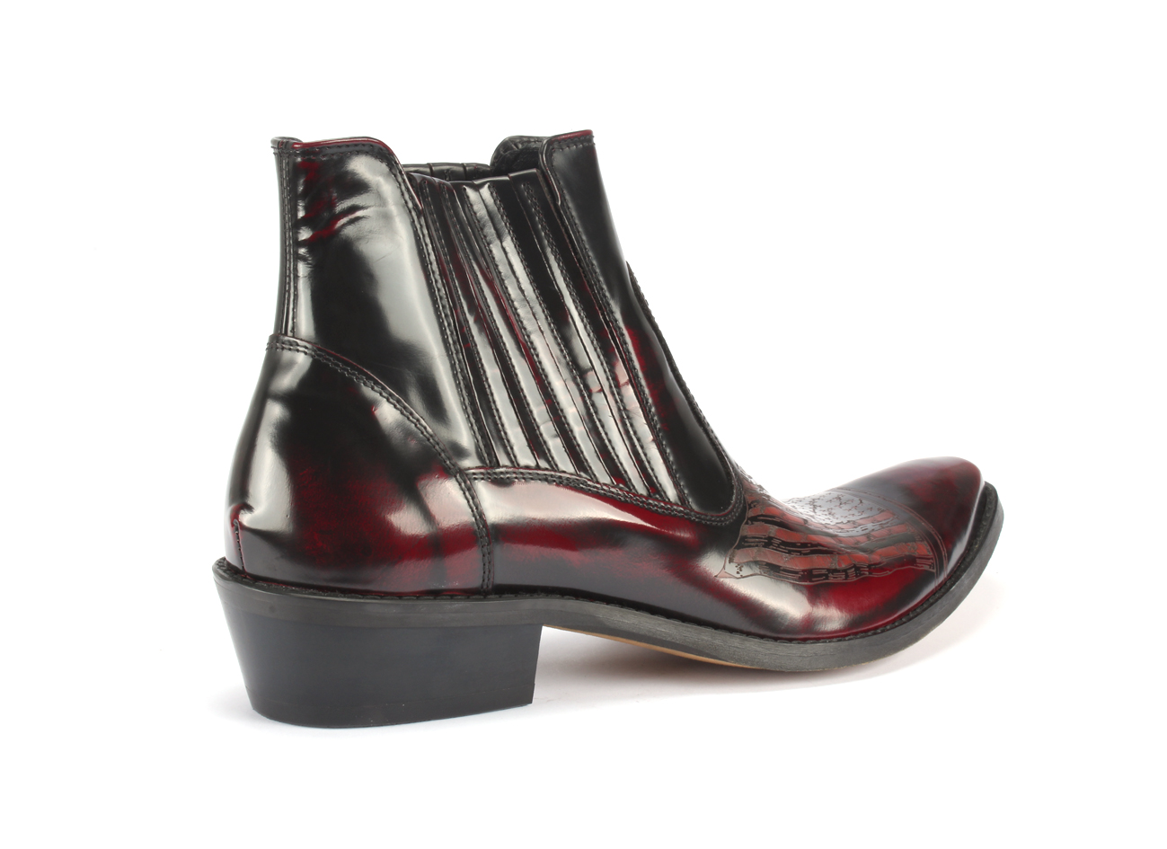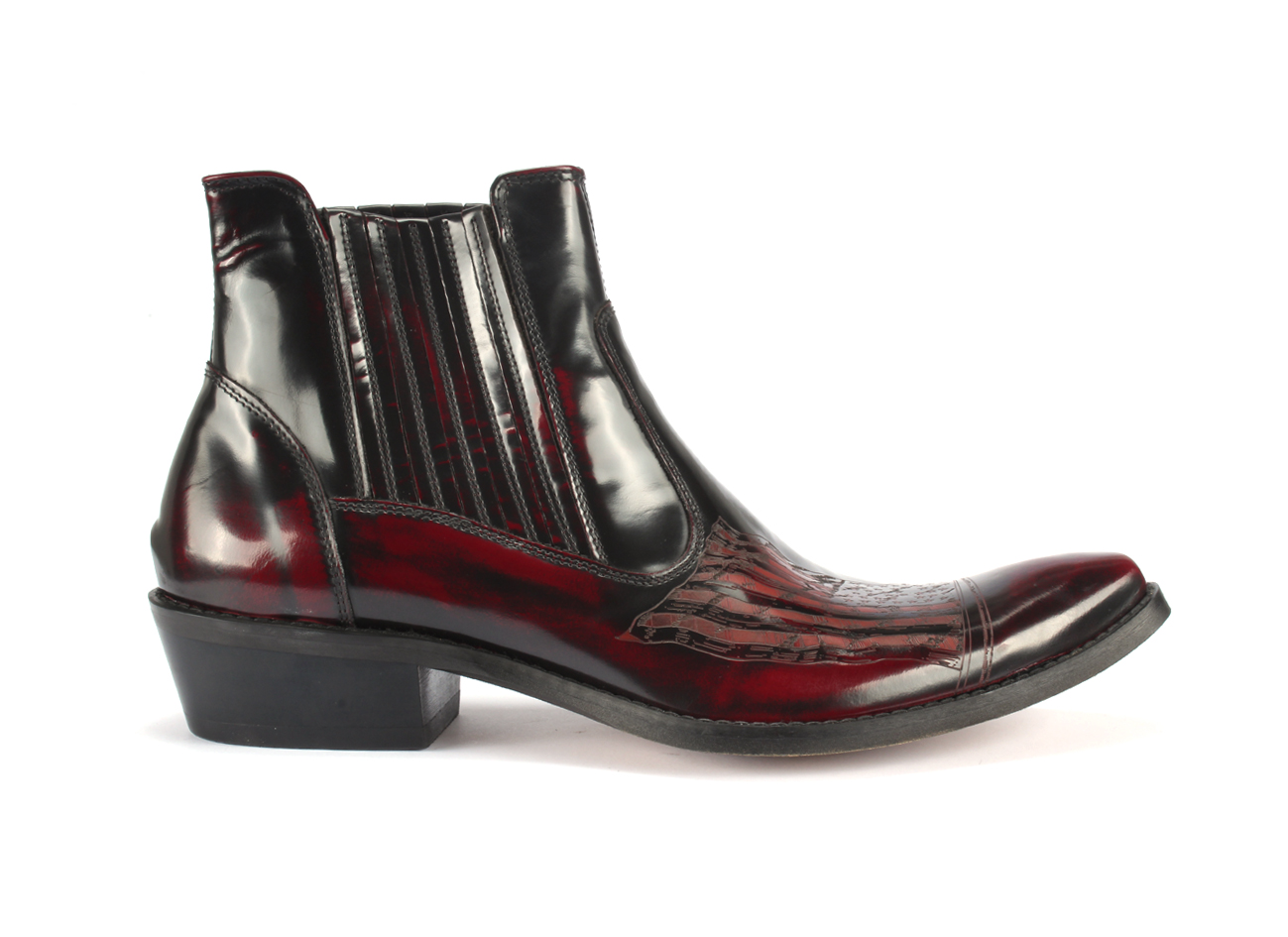 Skóra florentic wyróżnia się błyszczącą powierzchnią. Unikalny czerwony odcień został uzyskany przez przetarcie koloru czarnego, co nadaje butom niepowtarzalny charakter.